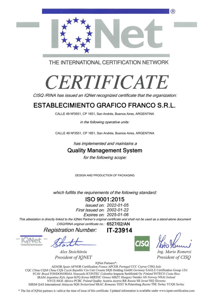 RINA adhiere a IQNet (Red Internacional de Certificación), que representa a la mayor red internacional de certificación de sistemas de gestión de la calidad, el cuidado medio-ambiental y de la seguridad y salud laboral.