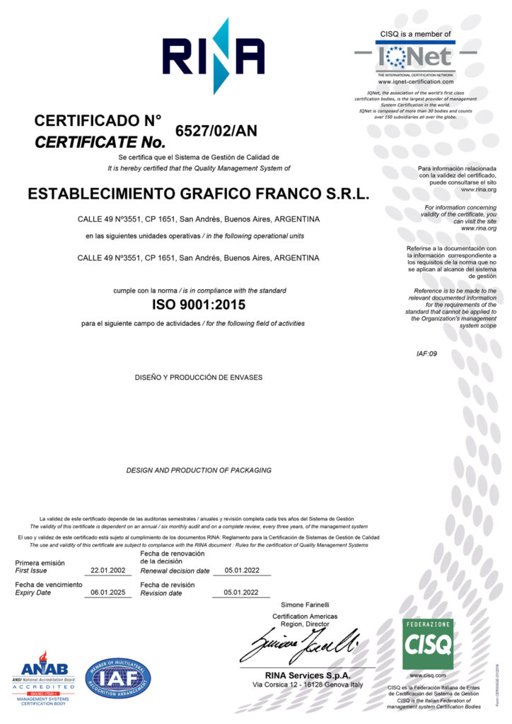 «RINA Services» (Registro Italiano Naval) es una organización certificadora cuya competencia adquirida en el sector marítimo la ha habilitado para diversificar progresivamente sus servicios de certificación relacionados con los sistemas de gestión, productos, instalaciones y personal.